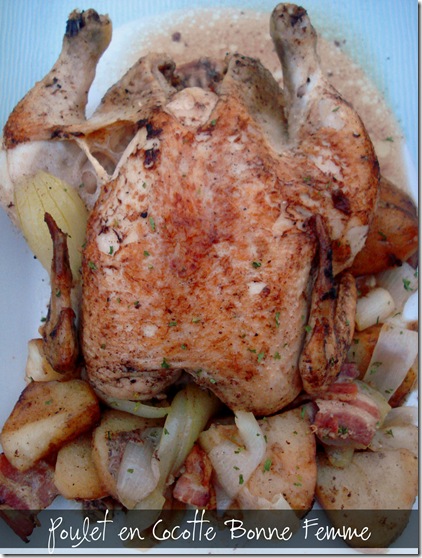 Poulet en Cocotte Bonne Femme, on page 252 of Mastering the Art of French Cooking by Julia Child. Apparantly this translates as Casserole roasted Chicken with Bacon, Onions and Potatoes. Huh. I don’t speak a lick of French, but I would have guessed this would have translated as Chicken in a Pot with a Good Woman. Or Chicken and Pot Makes a Good Woman. Something like that. But that’s just me.