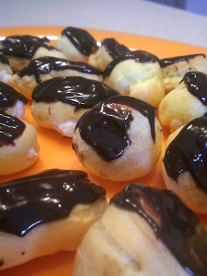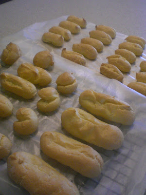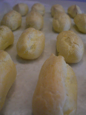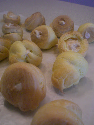 Okay, okay. I was supposed to be baking for the coffeeshop today, but I knew I could get it all done, so instead, I surfed around the Dorie group looking at all of the weekly baked goods. Low and behold, I tripped right onto Spatulas & Corkscrews boat and saw her pictures and recipe for the most decadent looking creampuffs and eclairs. Baby Seven was sleeping, so, what the hey, I gave it a shot. It’s labor intensive, yes, what with the one egg at a time, and all of the piping (it would be much easier with an assembly line) but the results – Oh My. This will be something I make, and make often. I made some sweet whipped cream for half, and for the other half I added some peanut butter to the cream. Geez Louise, that was good. I had to eat a few to make sure, but decided that yes, they were definitely worth all the trouble.