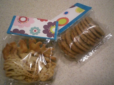 It took me a fair bit ofcussing and re-rolling to finally get the hang of these cutters, as they imprint as well as cut. A bit fickle, I would say, but once you get the hang of it, itsails along pretty quickly. One thing I was surprised about was the amount of cookies the recipe made. It states on the box tht the recipe will make around 20 of each animal shape – or 100 cookies. Looking at the amount of dough I made I thought NO WAY. Not even close. Well, I was wrong. It made almost exactly that amount. So, I packaged some up (not quite as prettily as StampinMama, who is very creative and sooo inspiring) and delivered them to a sick neighbor. The rest are reserved for hot sunny days at the Country Club kiddie pool, where you can never have too many treats nearby for hungry youngin’s!