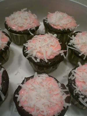 These are moist and delish – a devils food cake filled with a nice big dollop if coconut cream, and just for fun, I added a splash of Coconut extract to the cake batter before baking….I will not omit this step if ever I make them again, as this this was the BEST part! (or was it the center? or the frosting?)