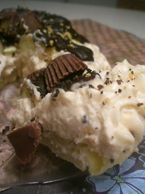 I kid. Sorry. Moving on…I cut up a few mini Reese Cups and tossed them into the center and over the sides of the ring, then sprinked PB/Chocolate flakes and a few Cocoa dots on for prettieness and Voila – Done and Done. We just ate a very small piece of this for dessert, and boy is it tasty. It’s kind of like a very light version of the PB torte we did (much lighter) and yet with the pastry, there is something to chew on. That to me is a great combo. I will probably make this again in the future, as now I know what I can do with my leftover pate a choux!