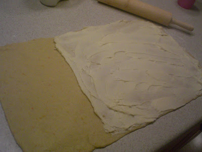 2. After the detrempe has chilled 30 minutes, turn it out onto a lightly floured surface. Roll the dough into a rectangle approximately 18 x 13 inches and ¼ inch thick. The dough may be sticky, so keep dusting it lightly with flour. Spread the butter evenly over the center and right thirds of the dough. Fold the left edge of the detrempe to the right, covering half of the butter. Fold the right third of the rectangle over the center third. The first turn has now been completed. Mark the dough by poking it with your finger to keep track of your turns, or use a sticky and keep a tally. Place the dough on a baking sheet, wrap it in plastic wrap, and refrigerate for 30 minutes.