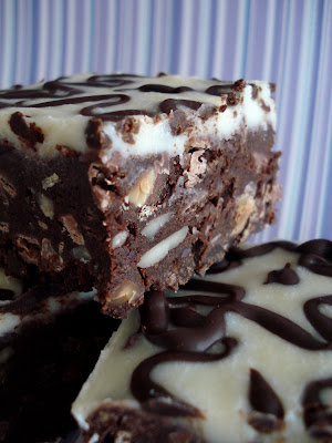 Put the white chocolate in a heatproof bowl. Bring the heavy cream to a boil and pour it over the chocolate. Wait 30 seconds, then, using a rubber spatula, gently stir until the chocolate is melted.and the glaze is smooth.Hold a long metal icing spatula in one hand the bowl of glaze in the other. Pour the glaze onto the center of the brownies and use the spatula to nudge it evenly over the surface. Don’t worry if it dribbles over the edges, you can trim the sides later (or not). Refrigerate the brownies for about 20 minutes to dry the glaze.Cut into 16 squares, each roughly 2 1/4 inches on a side.