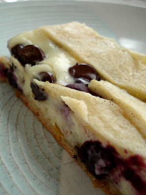 Sprinkle half of the chocolate chips and berries in the center of the dough, followed by all of the cream cheese mixture. Sprinkle the remaining chips and berries on top.