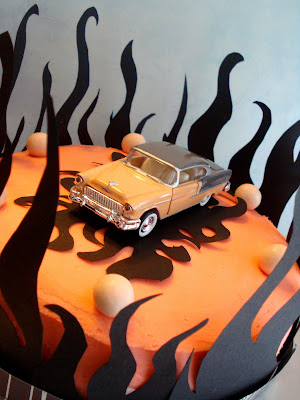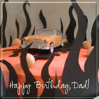 I cannot give a grown man a plain old coral cake. How lame. Earlier in the day I had called Mom and secured a mini 55 Chevy from their collection that I intended to perch atop said pink cake. But snooze…pink cake with toy car= a devoted post on CakeWrecks. I couldn’t have that. So I took a piece of my scrapbooking/photo shoot background paper and cut out a black flamey looking cake wrapper. Then I cut out a ring of black and gray striped paper to go over that. Once it was wrapped around the cake, it didn’t look half bad.