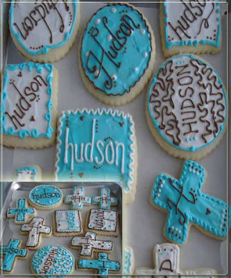So, Hudson. These cookies are for favors for his baptism. I wish we could have been there, but alas, 2000 miles is a little too far for us to travel this time. I hope they arrive safe and sound and taste as good as they do today! As you can see, they are decorated in brown, blueish teal and white, the colors of his announcement…or as close as I could get with icing, anyway! Crosses, squares and fancy circles make up the assortment.