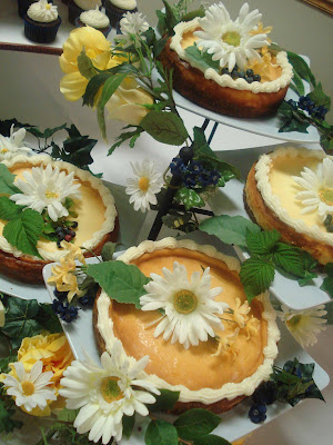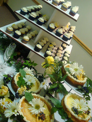 A couple of months ago, they contacted me to see if I would be willing to make a cheesecake wedding cake. Hmm. Never made a wedding cake before, much less a cheesecake wedding cake. But you all know how much I love a good cheesecake. So I agreed, and set out to make a BUNCH of Dorie Greenspans Cheesecakes. I started making them on Thursday and finished them up on Friday. They also wanted a bunch of cupcakes, so I made 4 flavors and decorated them with fondant daisies and displayed them on the stand that Jon made me.