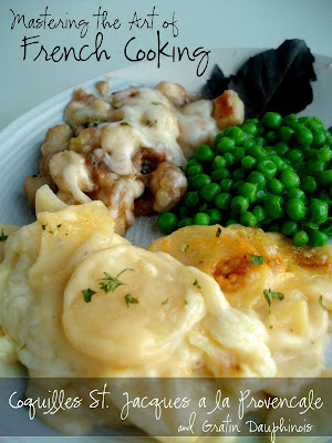 For our first meal from the book, I chose food items we already had in the house since I was still under the Challenge Budget. I had a bag of Bay Scallops that needed used, so I chose the recipe for Coquilles St. Jacques a la Provencale. In Susan’s kitchen, once you have said that about 7 times in.a.row to your husband, it becomes ScallopsDammitwithWineandCheeseJustQuitAsking, which works just as well and tastes the same going down. To Accompany the ScallopsDammit, we had Gratin Dauphinois – Cheesy Potatoes. Both recipes were excellent, easy to put together despite their fussy French names, and a really nice way to get out of the rut of our typical everyday meals. One can only eat Hamburger Helper or Grilled Chicken so many times before needing a break. (not ME, but, well, someone, I guess.)