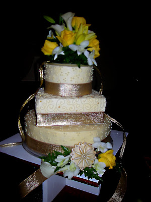 Here is a look at the 3 tiered stacked cake I made for a 50th anniversary party. The flowers were the choice of the client. Sorry for the bad picture quality, it was so dark in there!