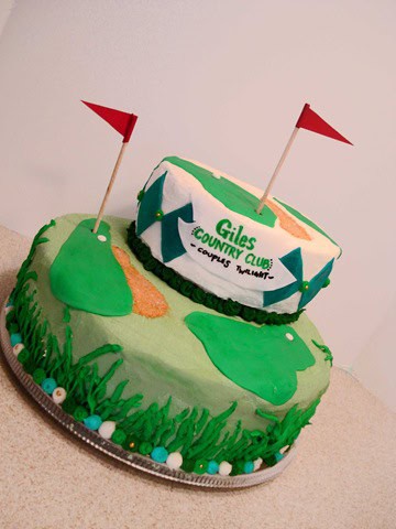 The final cake of the weekend was for our Couples Golf Tournament season ending. It was to feed about 50. The bottom layers were Milk Chocolate with Nutella Mousse and cut up candy bars, the top level was a yellow cake with caramel and crushed Dulce de Leche sugar cookies. (It was fab, by the way!) I decorated the bottom tier with light green buttercream and piped grass onto it, the top level i made fondant “argyle” to go around the sides. The tops of each layer were covered with fondant “greens” as well as graham cracker crumb sand traps. it got a lot of compliments, but I wish I had been able to do a little more with it. maybe there will be a next time! Until then – I’m taking a break!