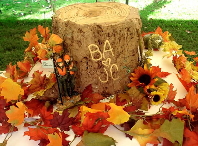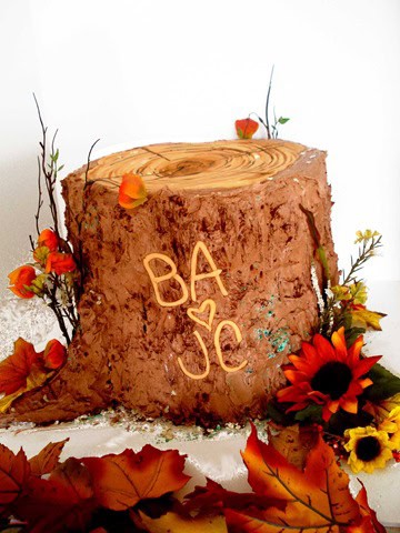 The first cake was for a wedding. I had serious concerns about this cake when I first took the order. It was to look like a tree stump. As realistic as possible, and yet, pretty enough to be a wedding cake. The bride and groom both hunt (I know!) and she had a topper made that showed the two of them in their camo. What emerged in cake form I am very pleased with! It was a very pretty wedding set-up – outdoors by a creek, lots of pumpkins and gourds and hay bales and such, and yet elegant at the same time.