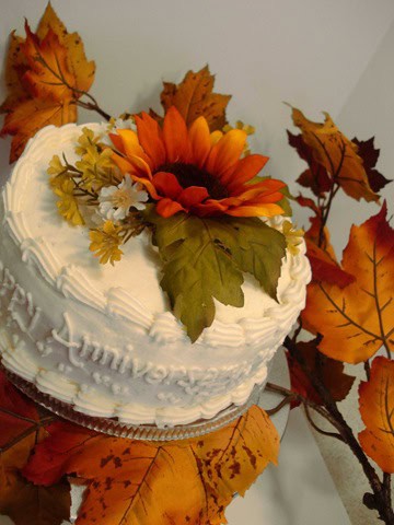 The other two cakes I made were not quite as scary. One was a small round for our friends, who were celebrating their 6 year anniversary. This cake was a sort of replica of the top tier of their wedding cake. I made it out of pumpkin and frosted it with a cream cheese icing. Various words like Happy Anniversary, Love, Baby – things that happened in the past 6 years – were written around the sides of the cake. So, if you are reading this…Happy Anniversary Friends! We love you!